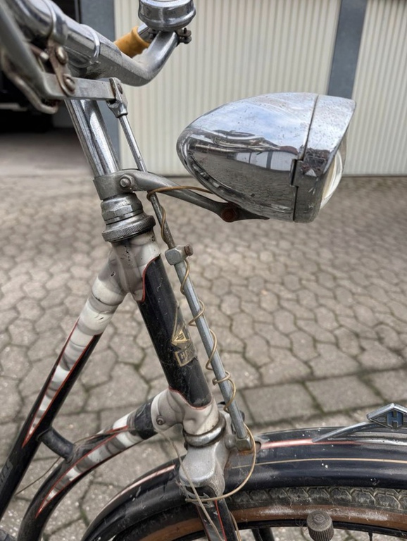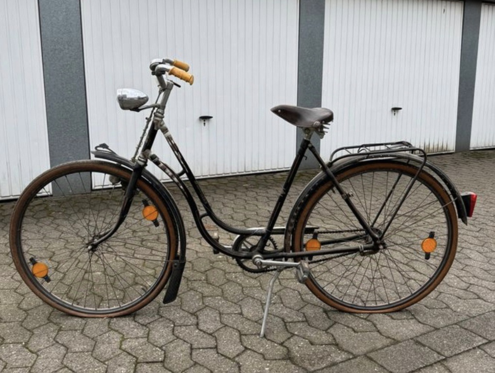 Gefunden in Lintorf über Ebay-Kleinanzeigen. Eigentlich suchte ich nur eine Klingel. (kenne ich irgendwo her!) Bis auf das Steuerkopfschild war das Rad komplett. (Zwischenzeitlich schickte mir Jo Wächter aus Köln das gesuchte Teil.)