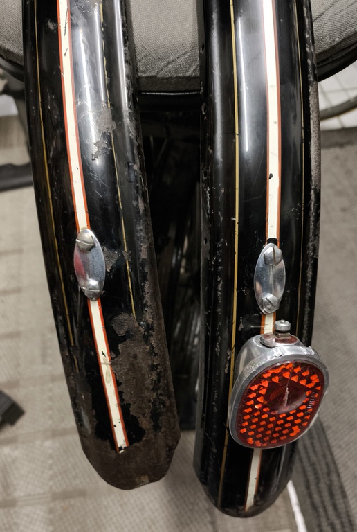 Offensichtlich waren beide Reifen platt, eine Pedal wurde einmal ersetzt, die Griffe unbrauchbar gebrochen, das Rücklicht unpassend, das Rocknetz abgängig und der Rost nagte unübersehbar an den Schutzblechen und Streben.