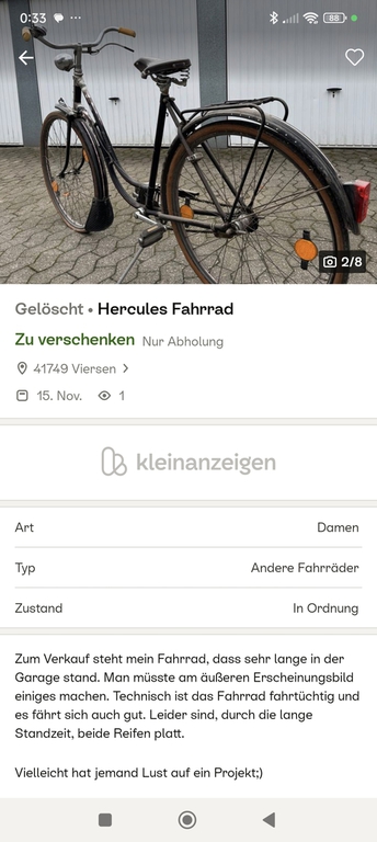 Mein Schrauberfreund Tobi wies auf ein Angebot in den Kleinanzeigen hin. Fahrrad Oldtimer zu verschenken in Krefeld. Außer mir schien kein anderer Interesse zu haben. Die Anbieterin war hocherfreut, ihre Garage im Zentrum Krefelds endlich leeren zu können. Bedingt durch einen Umzug wird diese nicht mehr benötigt.