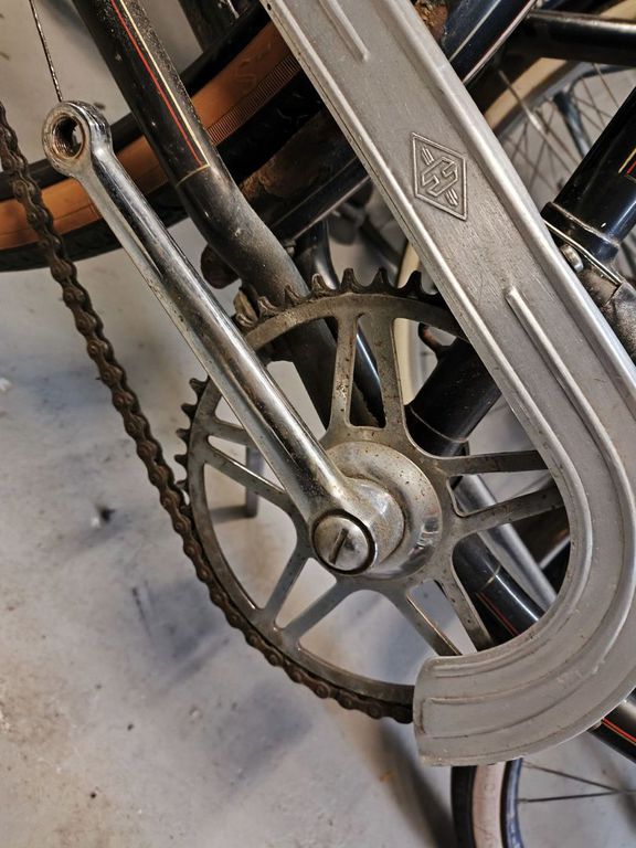 Bei Ebay Kleinanzeigen fand ich ein unkomplettes Rad für einen schmalen Taler. Unsere Tochter und ihr Mann verbanden einen Besuch in Mainz mit der Abholung der Teile. Die Steuerkopflager erneuerte ich bereits. Der Lack ist gereinigt und poliert. Das Tretlager hat kein Spiel und läuft sehr leicht. Da ich keinen Abzieher dafür besitze, bleibt es so wie es ist. "Never touch a running system!" Obwohl ich die originale Felge schon neu einspeichte, entschied ich die zugekauften Felgen zu nehmen. Die Patina passt besser zum Gesamterscheinungsbild.