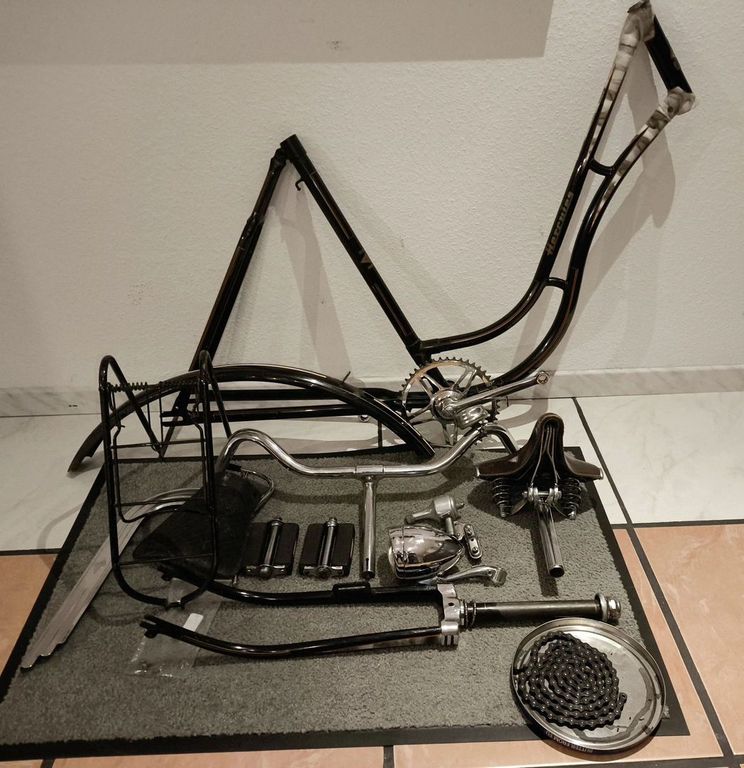 Für einen Strauß Blumen durfte ich es mir mitnehmen. Da das Hinterrad einmal komplett gewechselt wurde, konnte ich nur noch über die Rahmennummer das Baujahr bestimmen. Gut, dass man über Bekannte in Solingen verfügt, die mir dabei helfen konnten! Sattelkerze & Kloben, Lenker, Lichtanlage, Kettenspanner, Stempelbrems und Kleinkram hatte ich im Fundus. Ein farblich passender Laufradsatz wartete seit Jahren auf seinen Einsatz.