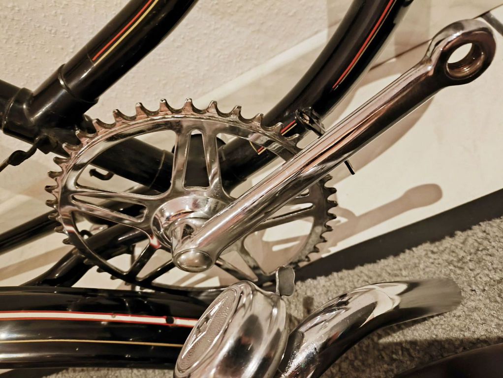 Aktualisierung 2025: Habe nach über 10 Jahren ein rostfreies Kettenblatt bekommen. Das Alte war nicht nur rostig, sondern hatte nur noch Haifischzähne. Mit einem geliehenen Abzieher ging der Wechsel des Tretlager leicht von statten. Nun musste allerdings auch der Lenker noch gewechselt werden, sonst wäre das Gesamtbild nicht stimmig!