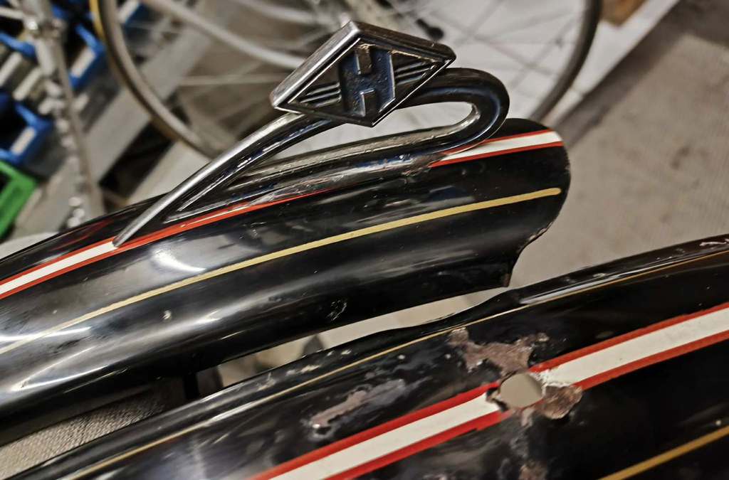 Besonders freute mich beim Auspacken, dass die Nabe aus dem Jahr 1949 stammt. Gereinigt und mit frischem Fett versorgt ist sie schon eingebaut. Den Schutzblechreiter polierte ich und montierte ihn ebenfalls.