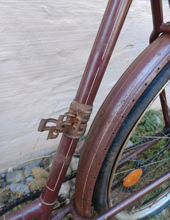 Das Rad wurde zwischenzeitlich zerlegt und aufbereitet. Gott sei Dank ist alles komplett, bis auf die Klingel. Keine Hoffnung, dass da jemals eine auftaucht. Wobei sich der Eindruck verstärkt, dass die montierte Klingel original ist. Der patinierte Zustand passt zum Gesamterscheinungsbild.