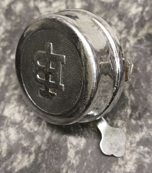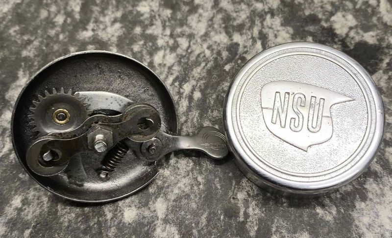 Einen originalen Klingeldeckel zauberte ich aus meiner Klingelsammlung hervor. Der Chrom ist an den Flanken zwar nicht mehr vorhanden, nach einer Politur ist das aber nicht mehr sichtbar. Ein Satz besser erhaltener Reifen montierte ich zwischenzeitlich.