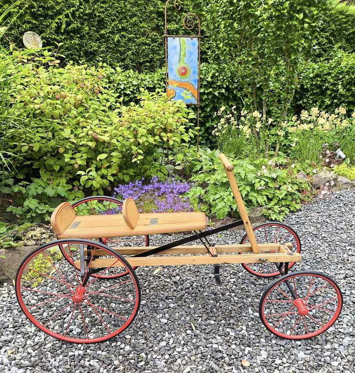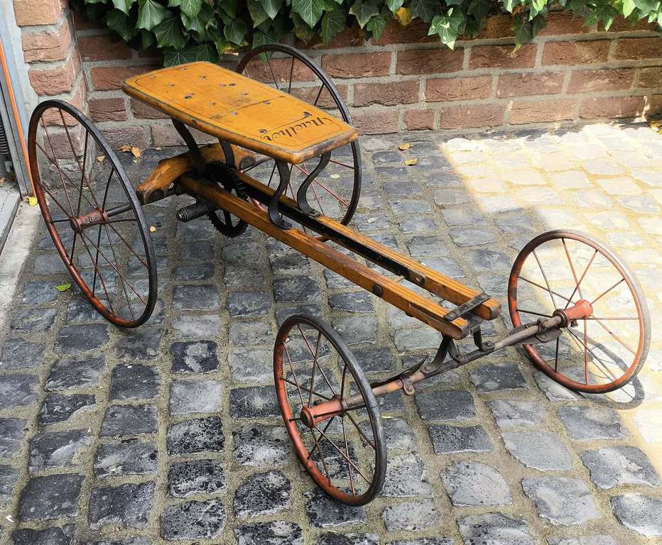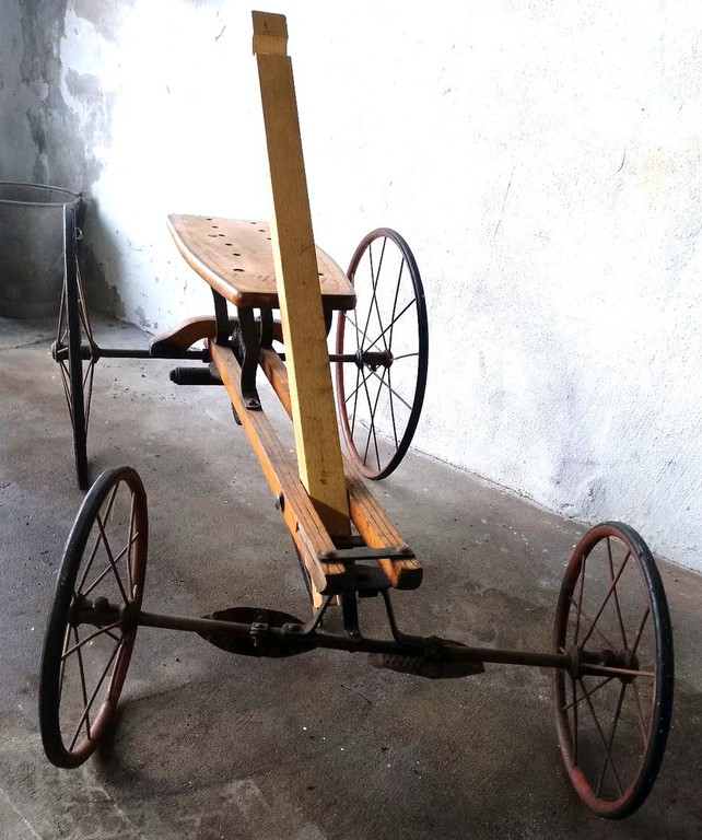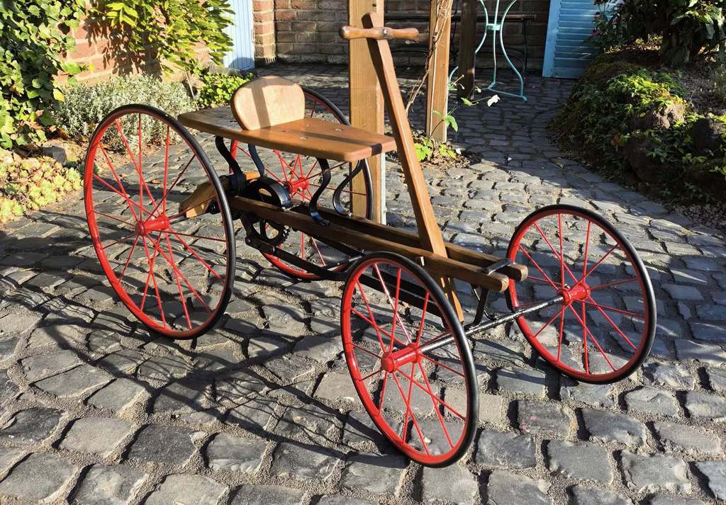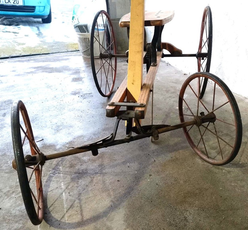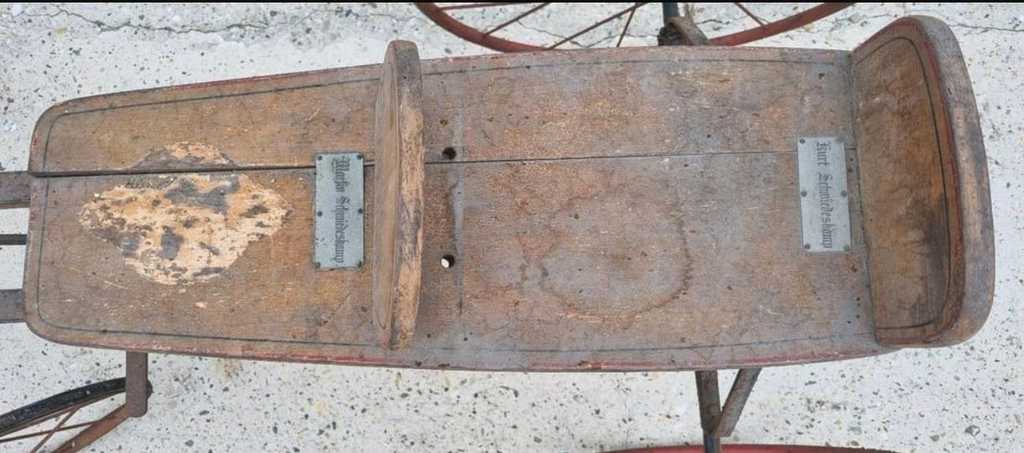 Das Gefährt stammt aus der Zeit zwischen 1910- 1920. Gefunden bei Ebay Kleinanzeigen, Standort Grevenbroich. Praktisch vor der Haustür! Ein "bisschen" muss gemacht werden, Die Sitzbank sollte verleimt und die Räder gerichtet werden. Mehr nicht!