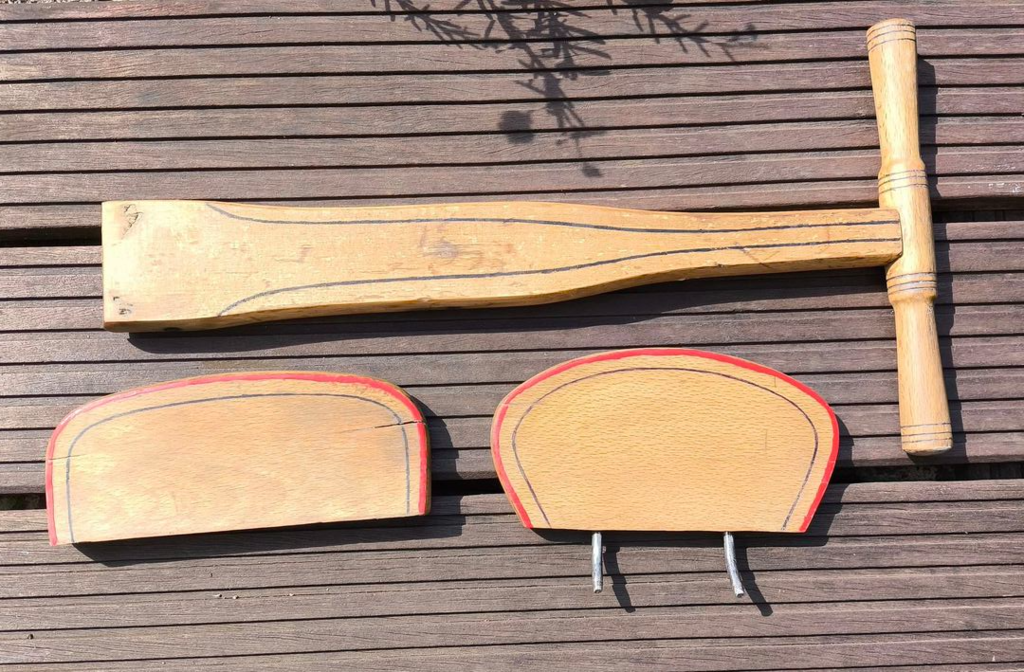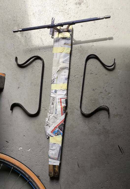 Angefertigt werden mussten 2 Blechteile zur Befestigung des Gurtes, 2 Metallteile zu Befestigung der Federn und der Holzgriff. Bis auf den ehemaligen Besenstiel und einen D-Ring hatte ich alles in der Werkstatt.