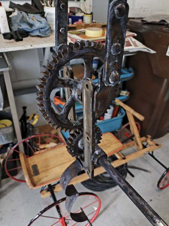 Bei der Vorbesitzerin hat es längere Zeit im Garten gestanden. Der Enkel inserierte es in den Kleinanzeigen. Der Zustand ist besser als es scheint, die Pedale und 1 Rad lassen sich sogar noch bewegen! Wenn alle anderen Projekte vollendet sind wird auch dieses Rädchen aufgearbeitet.