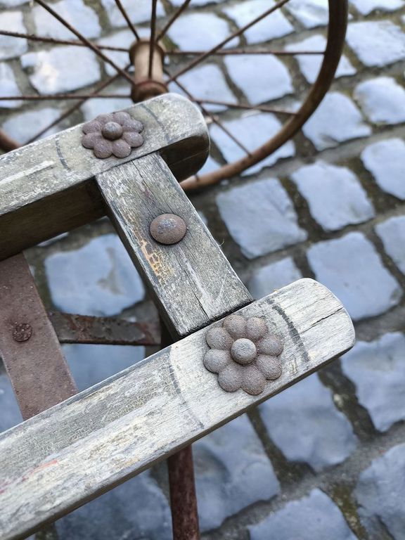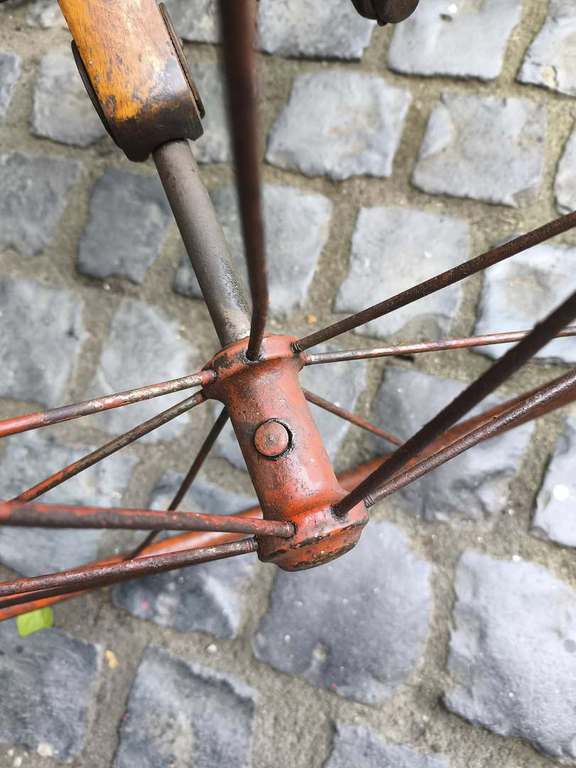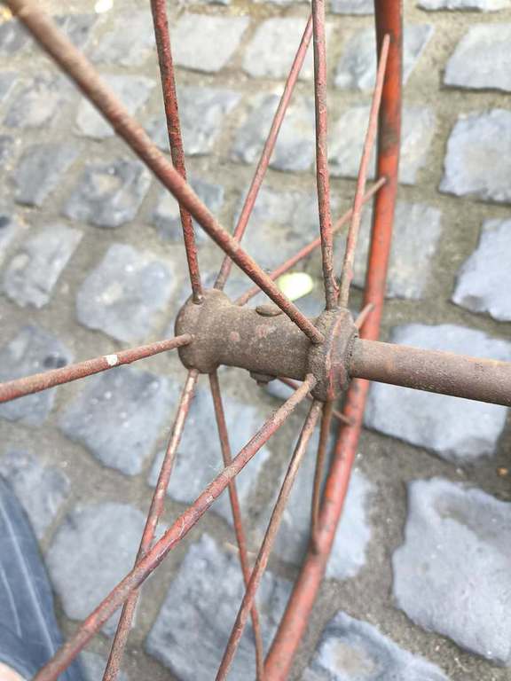 Da das überarbeitete Holz nicht mehr zum Gesamtbild passte, bekam es zwei Behandelungen mit Wachs. Die verrosteten Speichen behandelte ich mit Rostumwandler und lackierte sie in roter Farbe. Die ehemals roten Holzfelgen färbte ich mit einem roten Wachsmalstift ein.