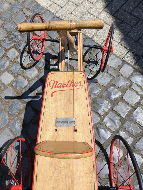 Ein intensives Studium der Kleinanzeigen brachte in Berlin ein zweites Exemplar hervor. Die Anzeige wurde 2022 aufgegeben ohne die Firmenbezeichnung und mit einem einzigen Foto von oben aufgenommen. Mir fiel erst bei längerer Betrachtung auf um was es sich handelt. Der Preis war sogar noch günstiger als der Hamburger Renner. Allerdings hat sich jemand mit Silberbronze an den Rädern ausgetobt und den originalen Sitz gegen eine hölzerne Eigenskonstruktion getauscht. Der originale Sitz ist aber noch vorhanden. "Marcelo Velo" aus Berlin bot das Abholen und den Versand an. Tolle Aktion!!!